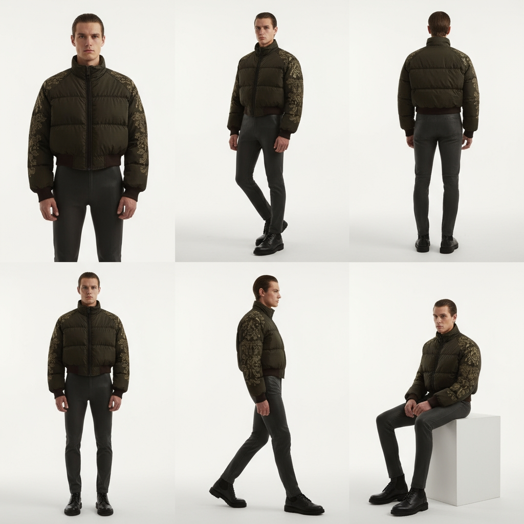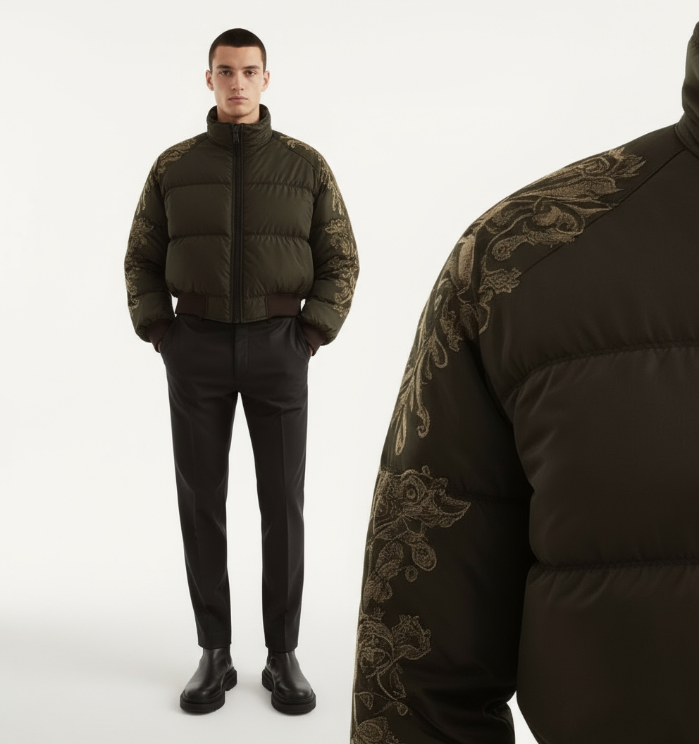The Glitch Gilded Ember Bomber fuses puffer warmth with embroidered elegance. Olive shell, golden floral details, and a silhouette built for street-luxury dominance.
