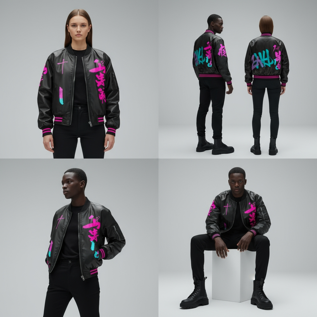 The Glitch Neon Ronin is designed for the rebels of tomorrow, taking the classic varsity bomber silhouette and charging it with futuristic energy. Its matte black shell becomes the perfect stage for neon pink graffiti strokes and aqua highlights, contrasted by striped cuffs and hem in electric pink. Combining streetwear, cyberpunk, and sporty nostalgia, this jacket feels like a crossover of eras — unapologetically bold, effortlessly stylish.