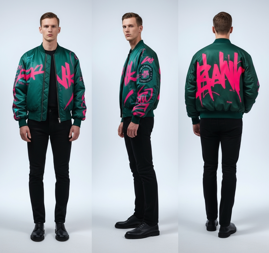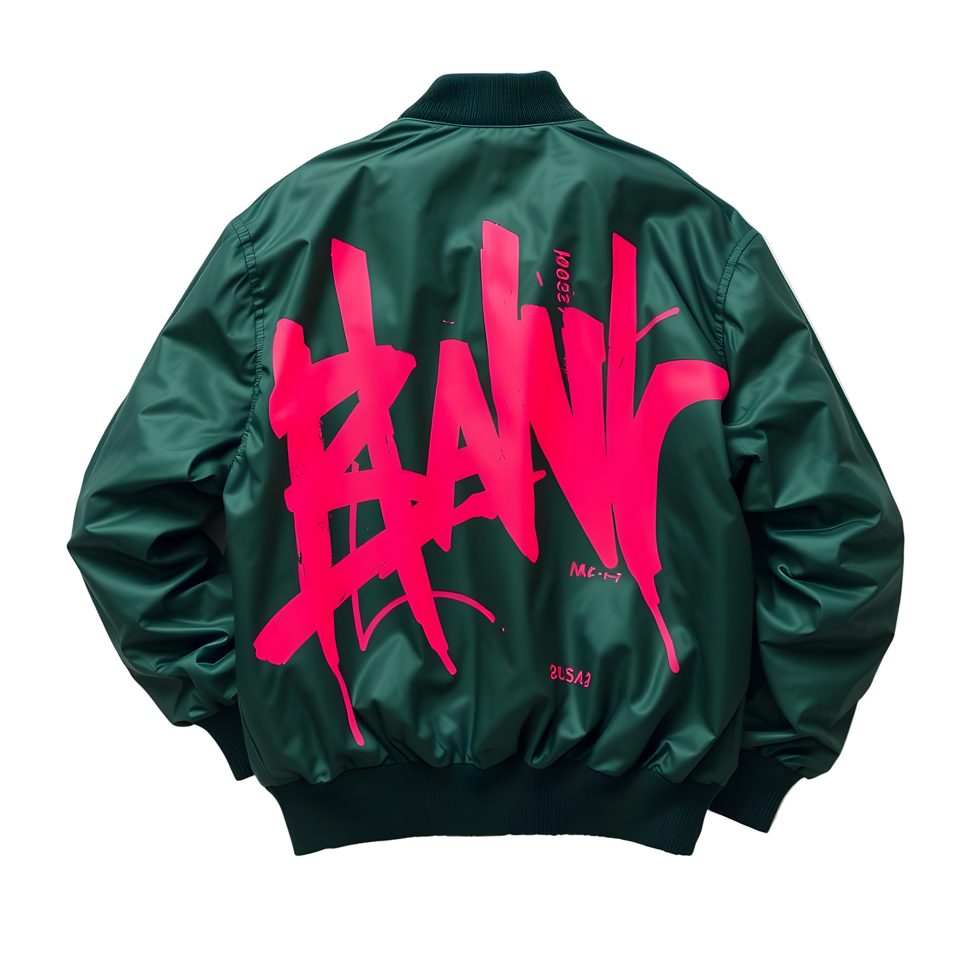 Step into the next era of streetwear with the Glitch Neon Verge. This bomber jacket combines cyberpunk-inspired colors with graffiti energy — glowing neon pink lettering sprawled across a rich emerald base. Built for those who push boundaries, it’s more than outerwear — it’s a declaration of bold individuality. Lightweight yet durable, this piece is the perfect balance of design and rebellion.