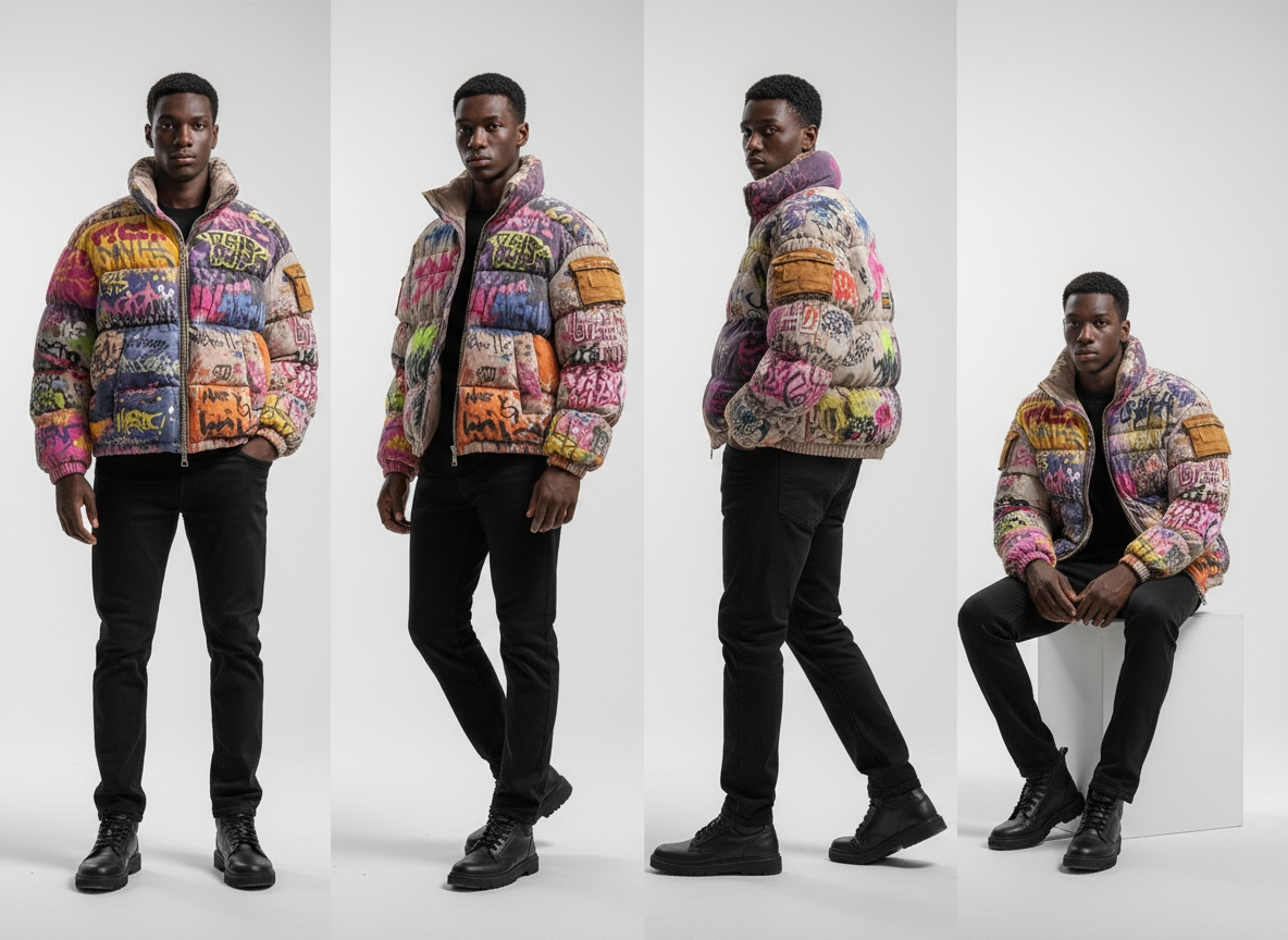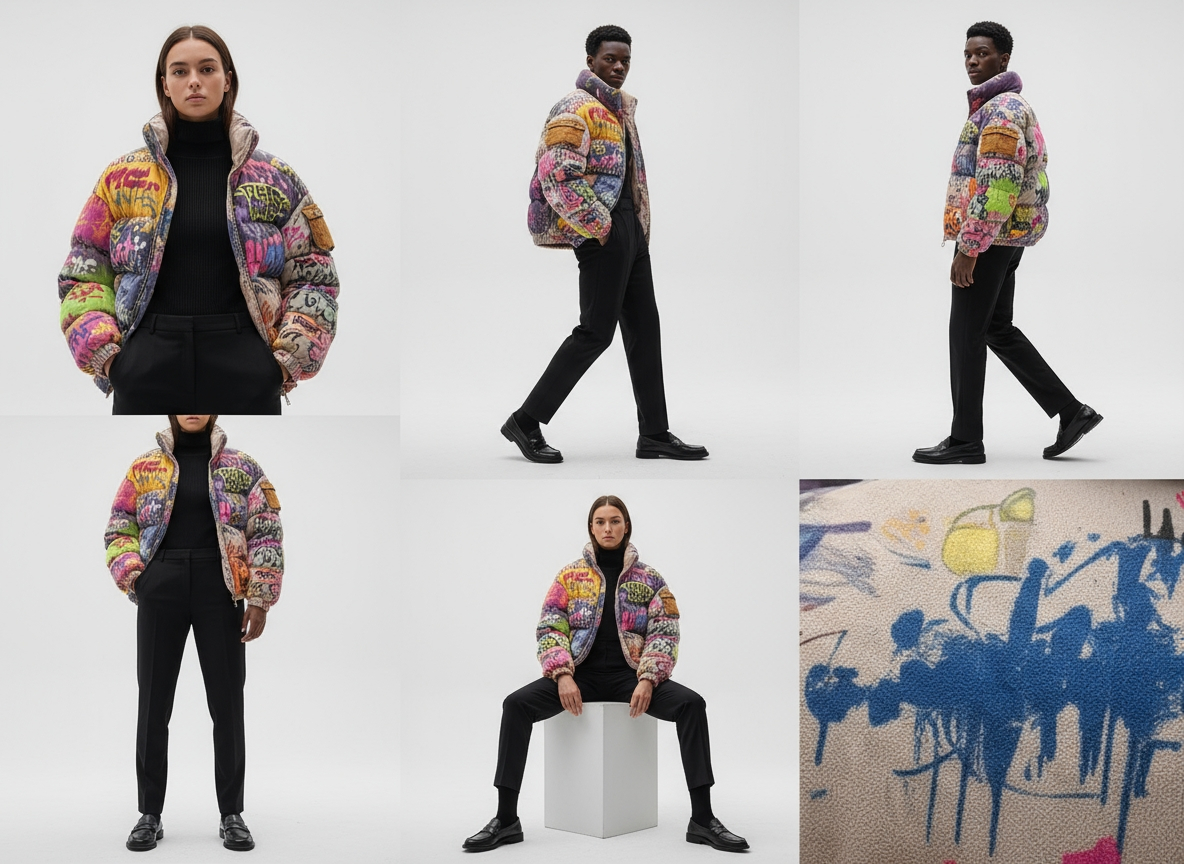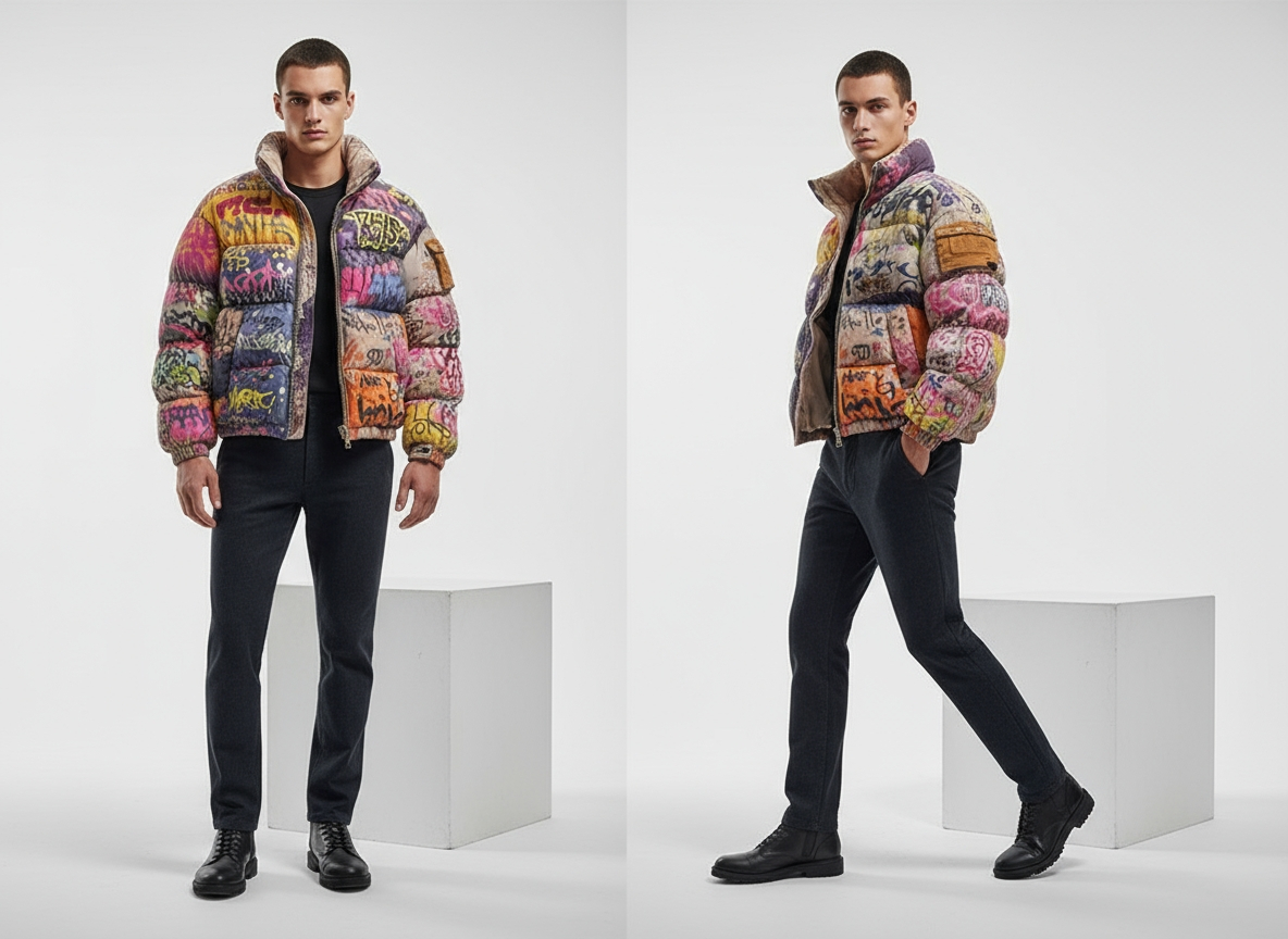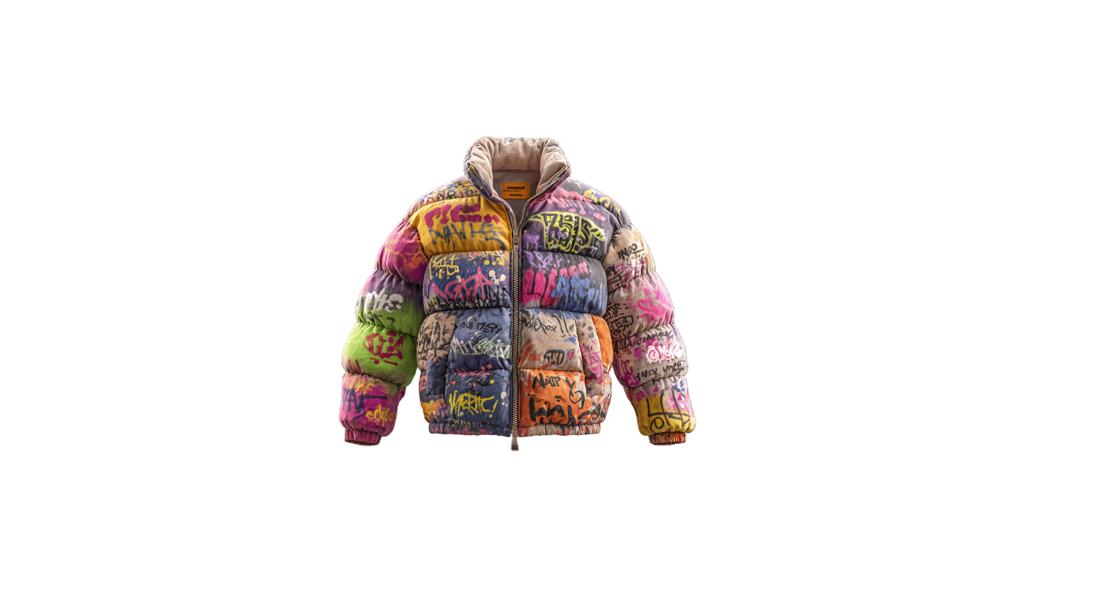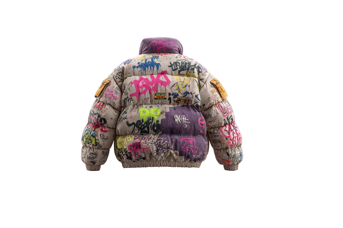 Explosive chaos meets couture. Vandalized Reality captures raw street rebellion in a riot of neon spray patterns splashed over a plush oversized puffer. Each color bleed tells a story of concrete jungles, midnight tag sessions, and fearless self-expression. For those who turn the city into their canvas.