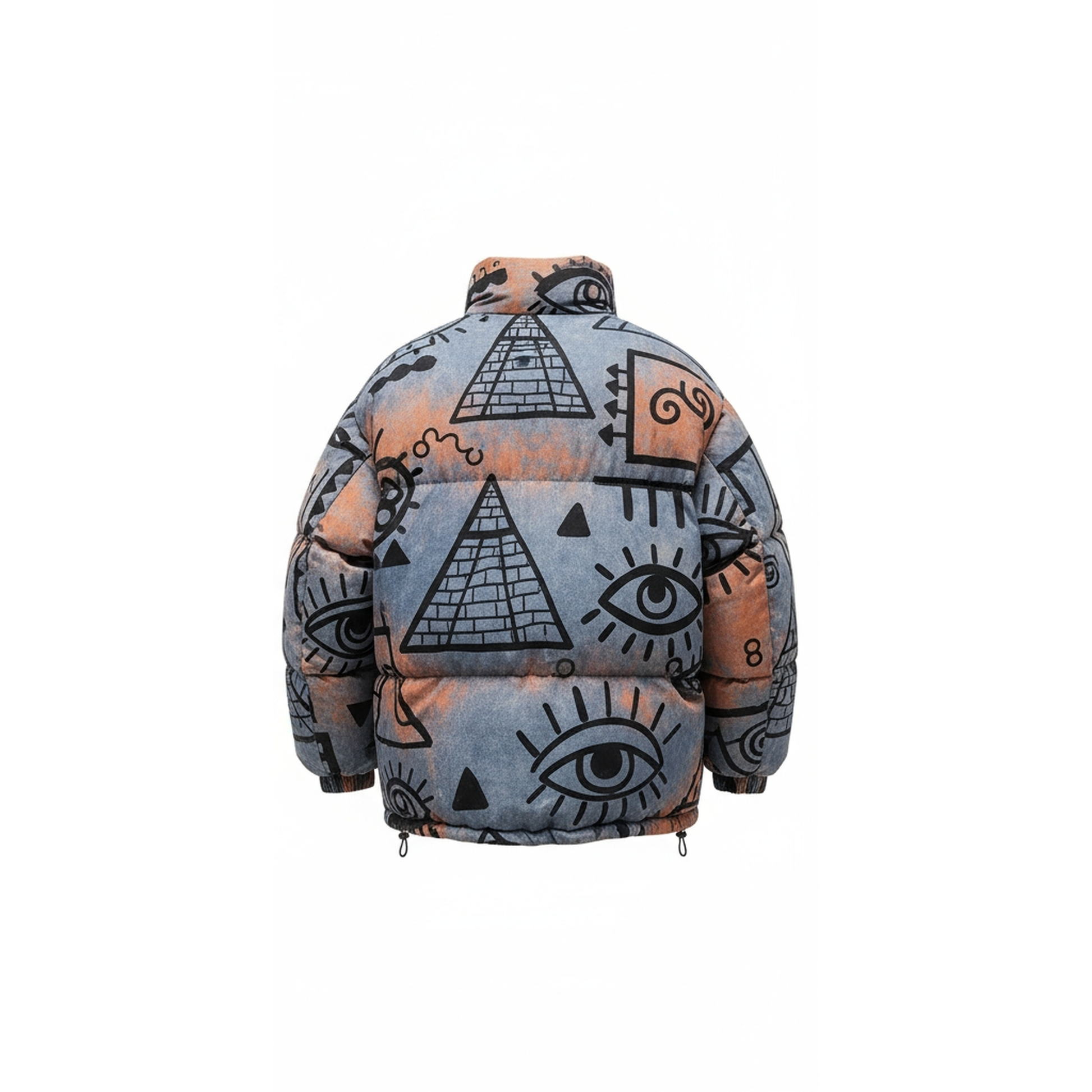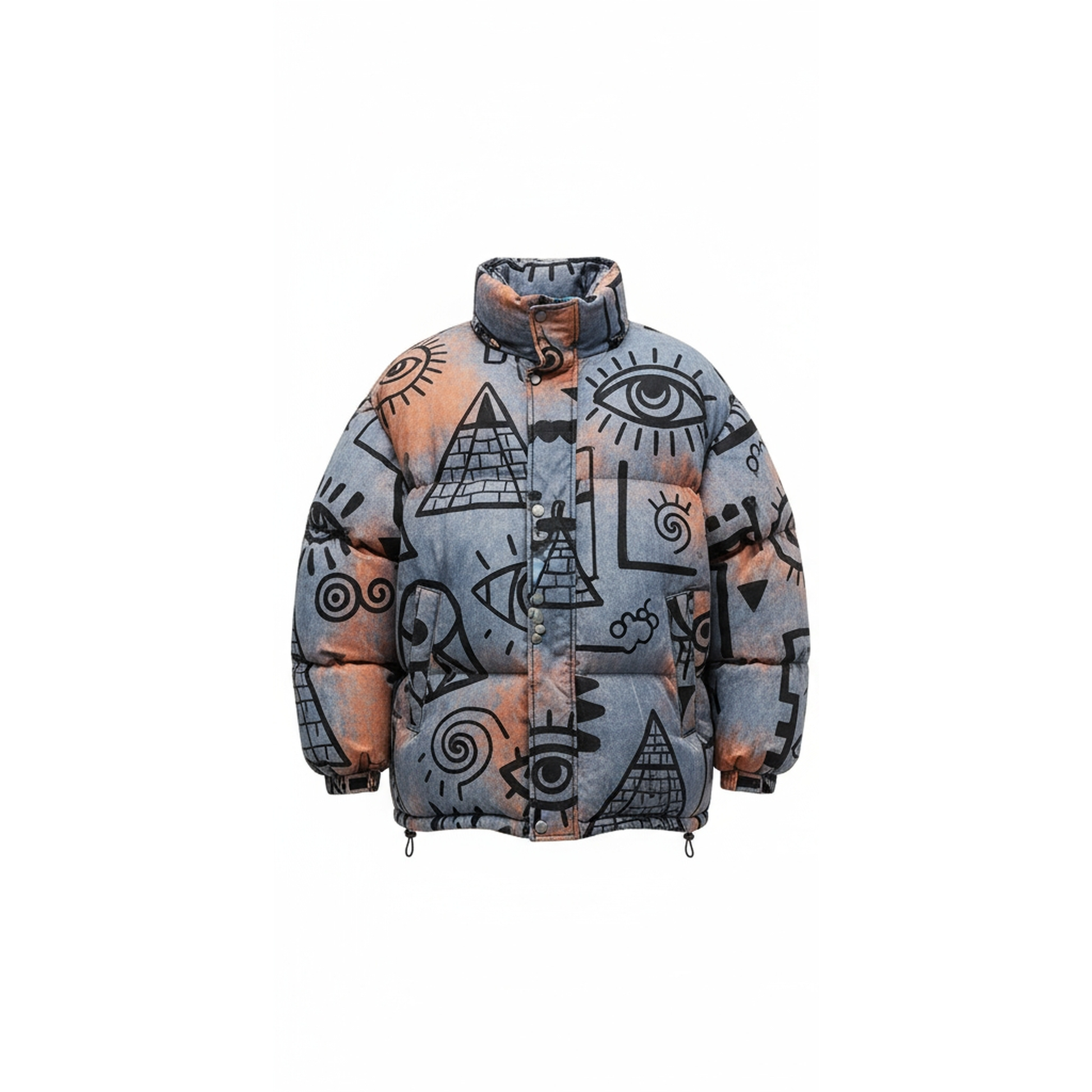 illuminate symbol with bold line art and abstract details, aged light navy blue and orange finish